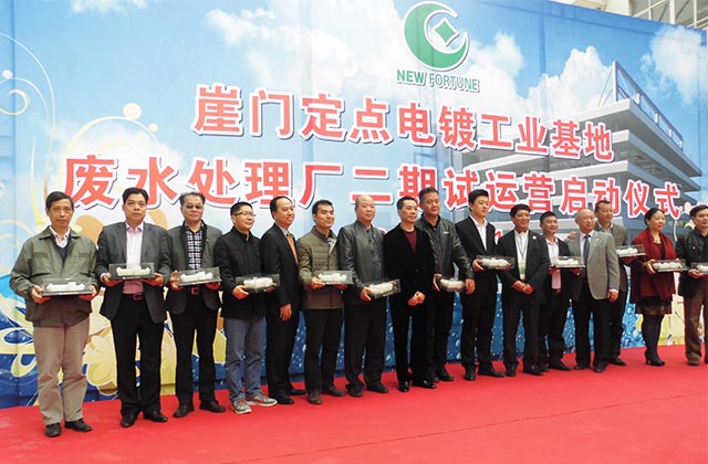 12月11日,江門市崖門新財富環保電鍍基地的廢水處理中心二期項目舉行的試運營啟動儀式。我司副總裁陳達華參加了該儀式。崖門新財富環保電鍍基地的廢水處理中心二期于2013年8月動工興建,以“方舟”作為外形設計,建筑面積為2.2萬平方米。作為珠三角電鍍區重金屬污染綜合防治重點示范項目,該項目獲得2012年中央財政重金屬污染防治重點區域專項資金5790萬元的支持。新建成廢水處理廠共有8條各類廢水處理線,日