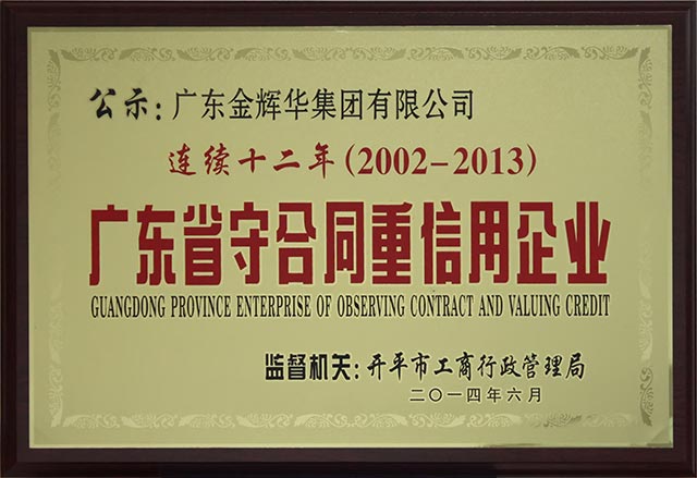 日前,我集團公司順利通過廣東省工商行政管理局的考核公示,被授予“連續十二年(2002-2013)廣東省守合同重信用企業”榮譽稱號,以表彰我司在守信經營、誠信經營方面的優秀表現。我集團公司一貫高度注重誠信體系建設,不斷規范合同管理,著力打造企...
