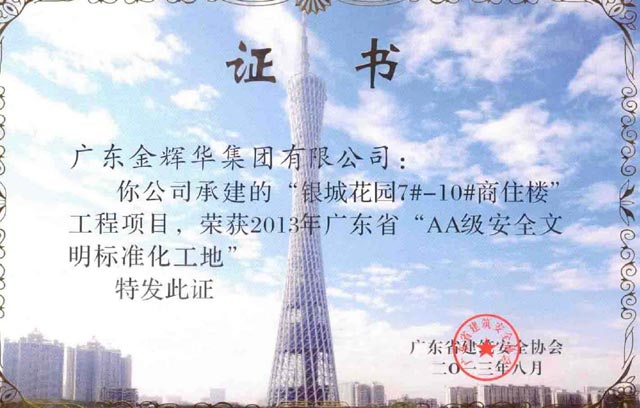 熱烈慶祝我公司“銀城花園7#—10#商住樓”榮獲AA級安全文明標準化工地。