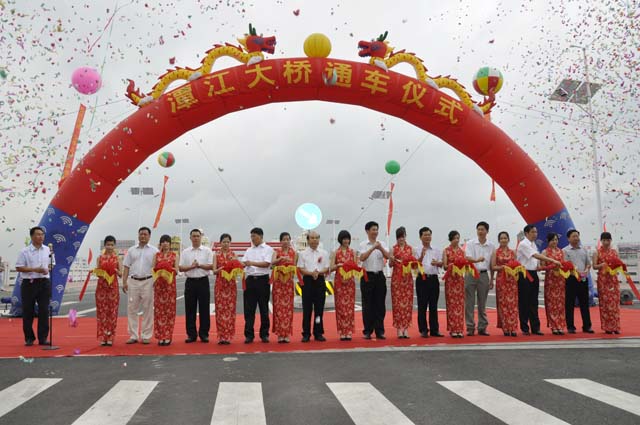 2011年6月22日上午,開平市委、市政府舉辦隆重而簡單的儀式,慶祝潭江大橋落成通車。市領導馮立堅、黃耀雄、吳平超、薛衛東、趙會強、張星杰、謝超武、陳偉成、梁和平,以及我集團公司項目領導小組成員部門單位的領導,參建項目的設計、監理、施工、監測等單位代表共50多人參加了儀式。潭江大橋經重建后全長328米,橋面寬度為31.5米,采取雙向6車道設計。全橋設計新穎,采用花崗巖欄桿,橋中主跨兩端設有四座景觀