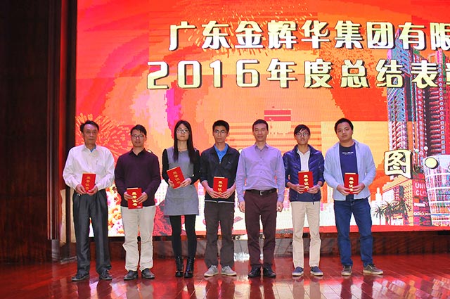 會議中董事局主席周珉興向所有員工發出了新春祝福!主席周珉興、董事長李甫、副總裁張國球、副總裁兼總工程師盧文權、副總裁兼黨委書記張解矛和團委書記譚翠瓊分別宣讀了表彰決定和優秀名單,并分別主持了公司工程優秀創優項目部、“2016省級工法”先進工作者、優秀員工、優秀黨員和優秀團員的表彰環節,領導們為他們頒發了榮譽證書,對他們所作出的成績進行了鼓勵,其中:表彰公司工程優秀創優項目部3個,“2016省級工法”先進工作者3名,優秀員工獎28名,表彰優秀黨員7名,優秀團員5名。最后由工會主席陳維民代表公司向受到表彰的各位同仁表示衷心的祝賀,向奮戰在各崗位的同事致以最真誠的感謝!并勉勵獲獎者們要珍惜榮譽、戒驕戒躁,把獲得的榮譽作為新的起點,在今后的工作中再做貢獻、勇創佳績!我們有理由堅信有這樣一批優秀的員工和團隊,在他們共同努力下,2017年將又是一個收獲的吉祥年。總結大會后,上演了一場歡天喜地的迎春晚會,晚會中,江門市建筑協會會長李耀南上臺作了重要講話,并充分肯定金輝華集團有限公司的成績,勉勵金輝華集團有限公司為重振開平建筑業雄風實現跨越發展再立新功。
