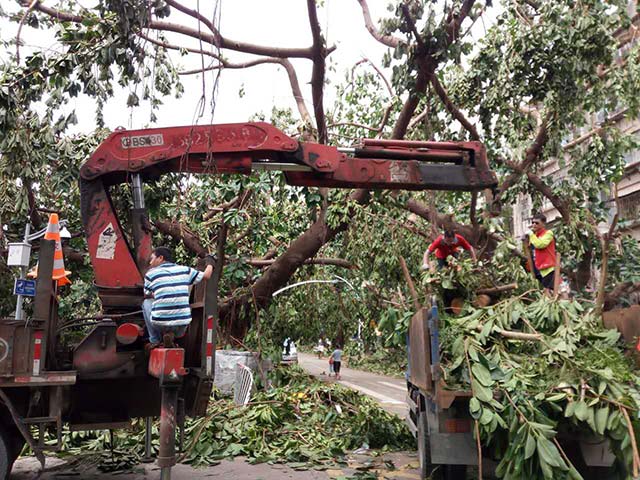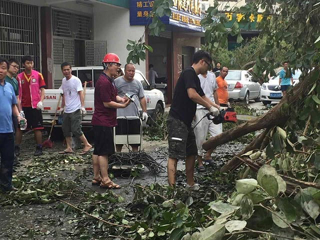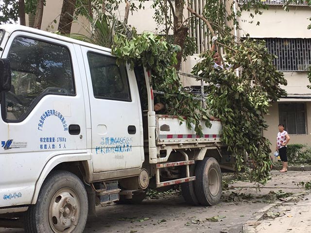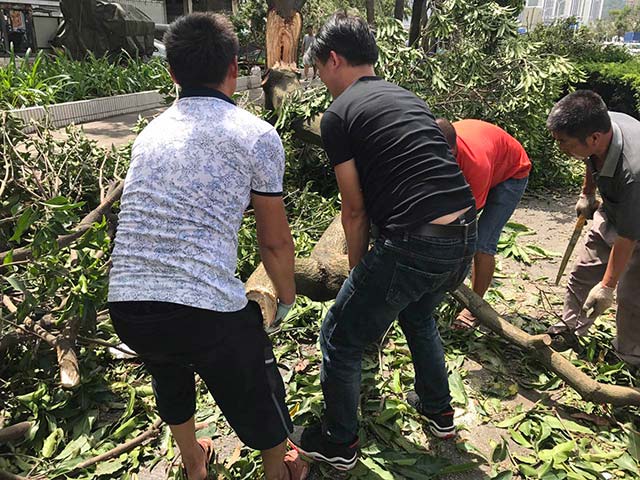 2017年8月23日中午12點(diǎn)50分,第13號(hào)臺(tái)風(fēng)“天鴿”正面襲擊珠海市,大批樹木被攔腰折斷或連根拔起,造成大部分主干道堵塞,嚴(yán)重影響當(dāng)?shù)鼐用窆ぷ骱蜕睢!疤鞛?zāi)無情人有情”,我集團(tuán)珠海公司在獲悉災(zāi)情后,迅速行動(dòng),組織人員和車輛,全力以赴針對(duì)突出的受阻道路進(jìn)行清理工作。在安平路、桃園路、海虹路、東風(fēng)路等路段,隨處可見殘樹斷枝錯(cuò)亂橫陳,珠海公司員工與當(dāng)?shù)鼐用褚黄鹎鍜呃嵋茦淠尽V钡皆撀范吻逭瞎ぷ魍瓿桑缆方煌ɑ净謴?fù)。
