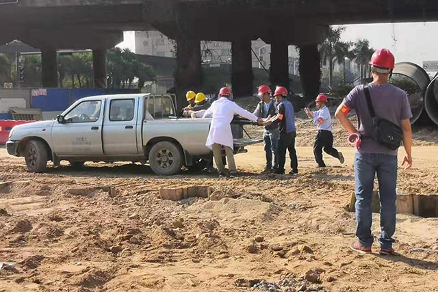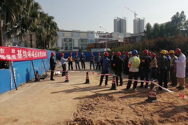 2019年11月21日(星期四)早上9:30,廣東金輝華集團公司承建的江門市供水管網擴容改造建設項目勘察設計施工總承包工程,在江門市蓬江區奇榜片區五邑機電城旁施工現場,進行”基坑坍塌應急救援演練”活動。演練的目的:1、評估安全事故的應急預案的響應啟動執行力和響應及時性,分析預案內容的針對性和真實性;2、檢驗應急響應人員對應急預案的了解及實際操作熟悉能力,對應急物資的使用熟悉程度,評估應急知識培訓的效果,分析培訓需求,同時作為一種培訓手段,通過調整演練難度,進一步提高應急響應人員的綜合素質能力,提高全員安全意識。