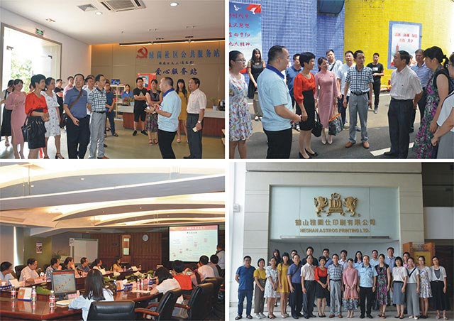 參觀鶴山雅圖仕印刷有限公司的生產區內黨委工作室和生活區內義工愛心服務站等黨建陣地